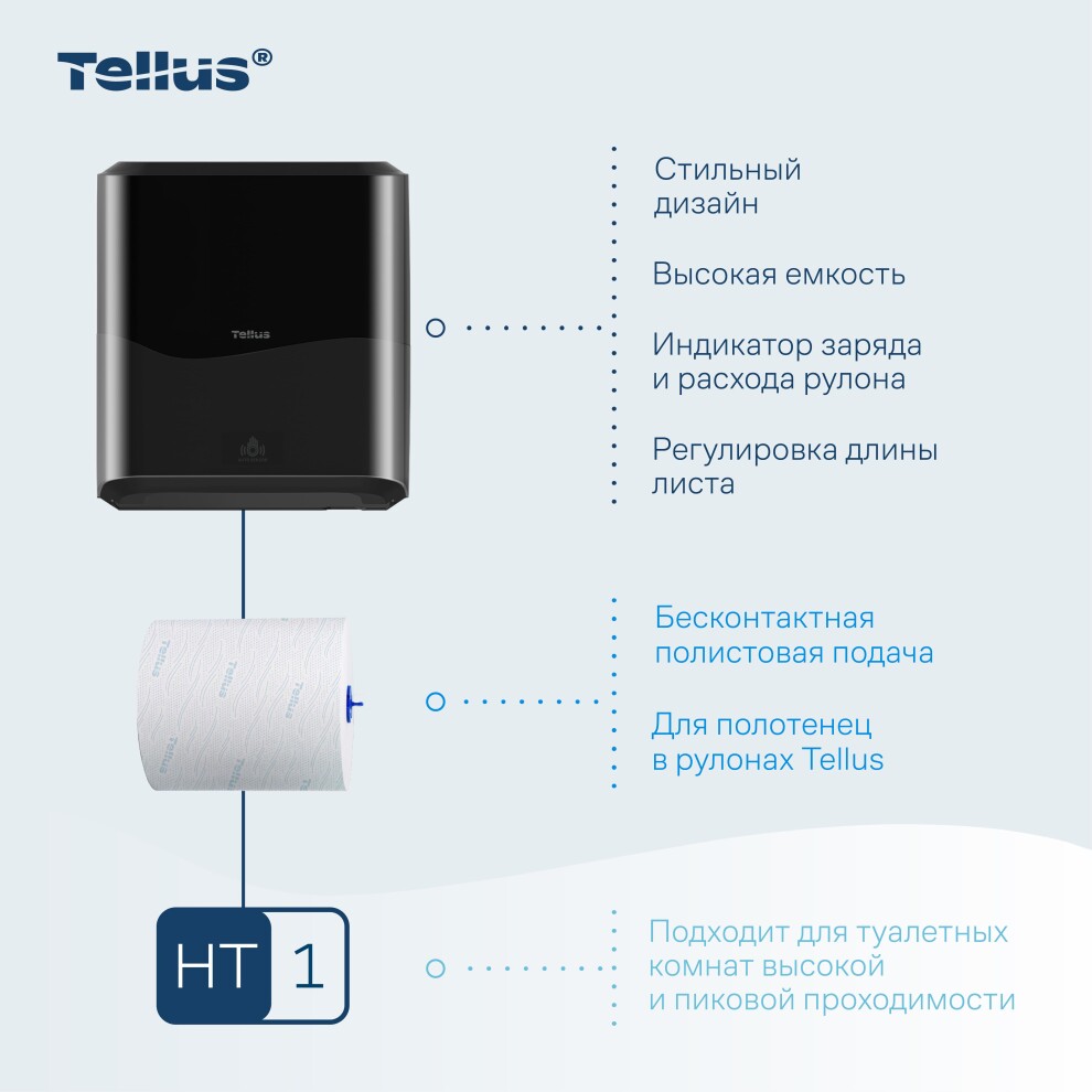 Tellus Matic Solution® диспенсер для полотенец для рук в рулонах — простая в обслуживании система с полистовым отбором для туалетных комнат высокой проходимости. Лаконичный и универсальный дизайн диспенсеров подходит к любому интерьеру, интуитивно понятная конструкция позволяет легко взаимодействовать с диспенсером на всех этапах — от монтажа до повседневного использования.